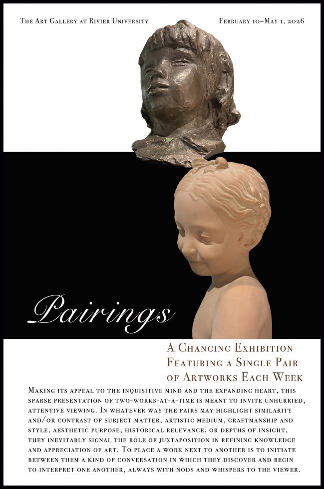 PAIRINGS is inspired by a long-time estimate, from museum sources, that the average time spent looking at a single artwork is thirty seconds. In response, The Art Gallery is experimenting with showing only two-at-a-time: twosomes presented as deliberate but not necessarily obvious pairs.
