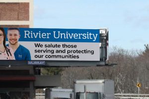 Rivier University billboard praises the efforts of all front line workers.